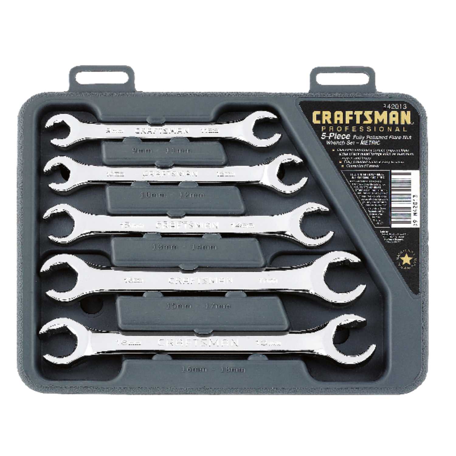 Craftsman 5 Piece Flare Nut Wrench Set SAE Flare Nut Wrench Set pack of 5 flare nut wrenches in sizes 9 x 11, 10 x 12, 13 x 14, 15 x17 and 16 x 18mm. 8 x 10, 11 x 13, 12 x 14, 17 x 19, 22 x 24. 4/5 (1,522) Drop forged of alloy steel for durability with full polish nickel chrome plated for long tool. Sign up. Flare Nut Wrench Set.